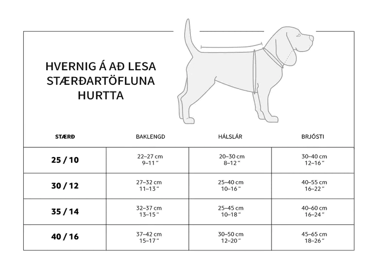- Mældu lengd baks, háls, bringu og bæði fram- og afturfætur og notaðu skýringarmyndina sem leiðbeiningar.
