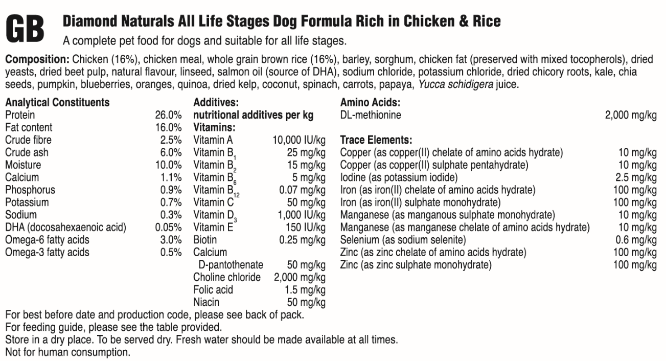 Protein 26.0% Fat content 16.0% Crude fibre 2.5% Crude ash 6.0% Moisture 10.0% Calcium 1.1% Phosphorus 0.9% Potassium 0.7% Sodium 0.3% DHA (docosahexaenoic acid) 0.05% Omega-6 fatty acids 3.0% Omega-3 fatty acids 0.5%