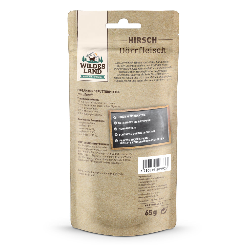 Wildes Land kjötrúllurnar eru blíðlega loftþurrkaðar til að varðveita bragð og næringargildi. Þær eru mjúkar, próteinríkar og einstaklega bragðgóðar – fullkomnar sem daglegt snarl eða verðlaun fyrir hunda. Rúllurnar innihalda kollagen, sem styður við liðheilsu, húð, feld og meltingu.